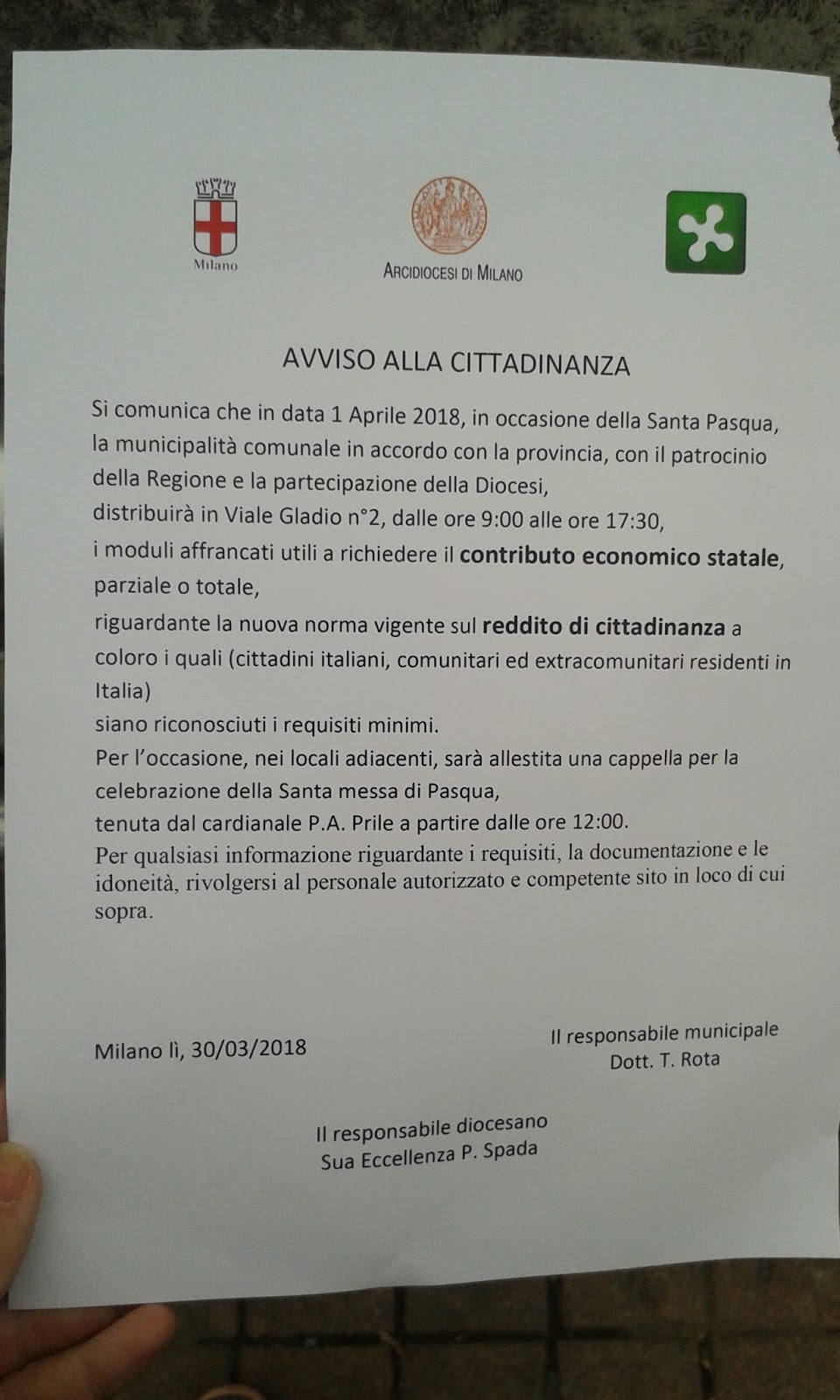 Infine, il nome del sedicente «responsabile diocesano», se l’annuncio fosse serio, sarebbe più simile a «monsignor» o «don P[nome completo] Spada, Responsabile Ufficio [nome ufficio competente]». Negli editoriali per gli strumenti di comunicazione parrocchiale, i nomi degli autori sono sempre indicati così.